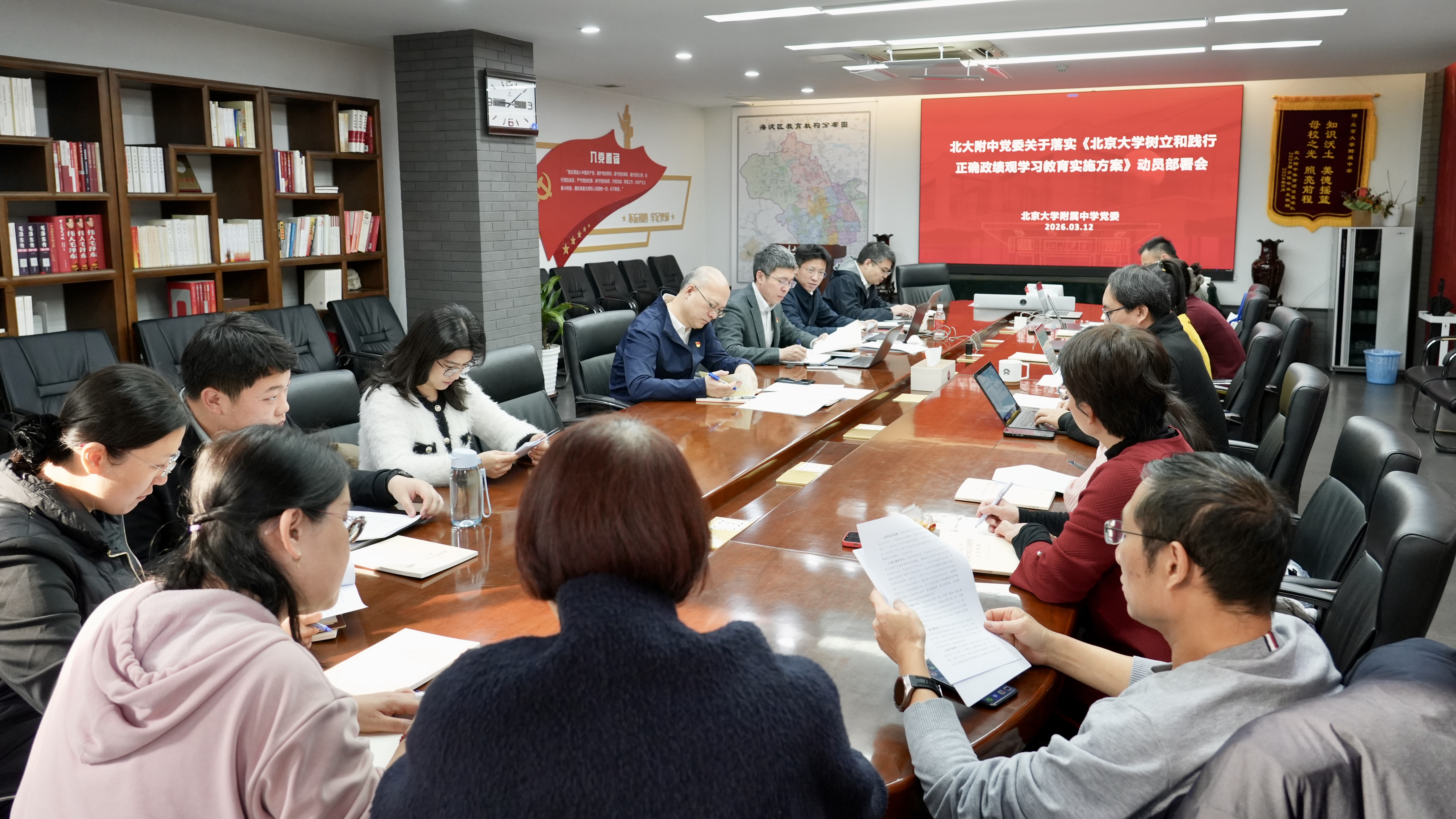 会议首先集中传达学习上级关于开展树立和践行正确政绩观学习教育的有关精神,明确学习教育的重要要求和推进路径。随后,党委副书记、副校长李明对《北大附中树立和践行正确政绩观学习教育实施方案》进行解读,明确本次学习教育以习近平新时代中国特色社会主义思想为指导,紧扣“立党为公、为民造福、科学决策、真抓实干”总要求,一体推进学查改,着力纠治政绩观偏差。《方案》明确了工作安排,指出学习教育至7月底基本结束,覆盖全校党员干部及教师,构建起系统谋划、有序推进、闭环落实的工作体系。