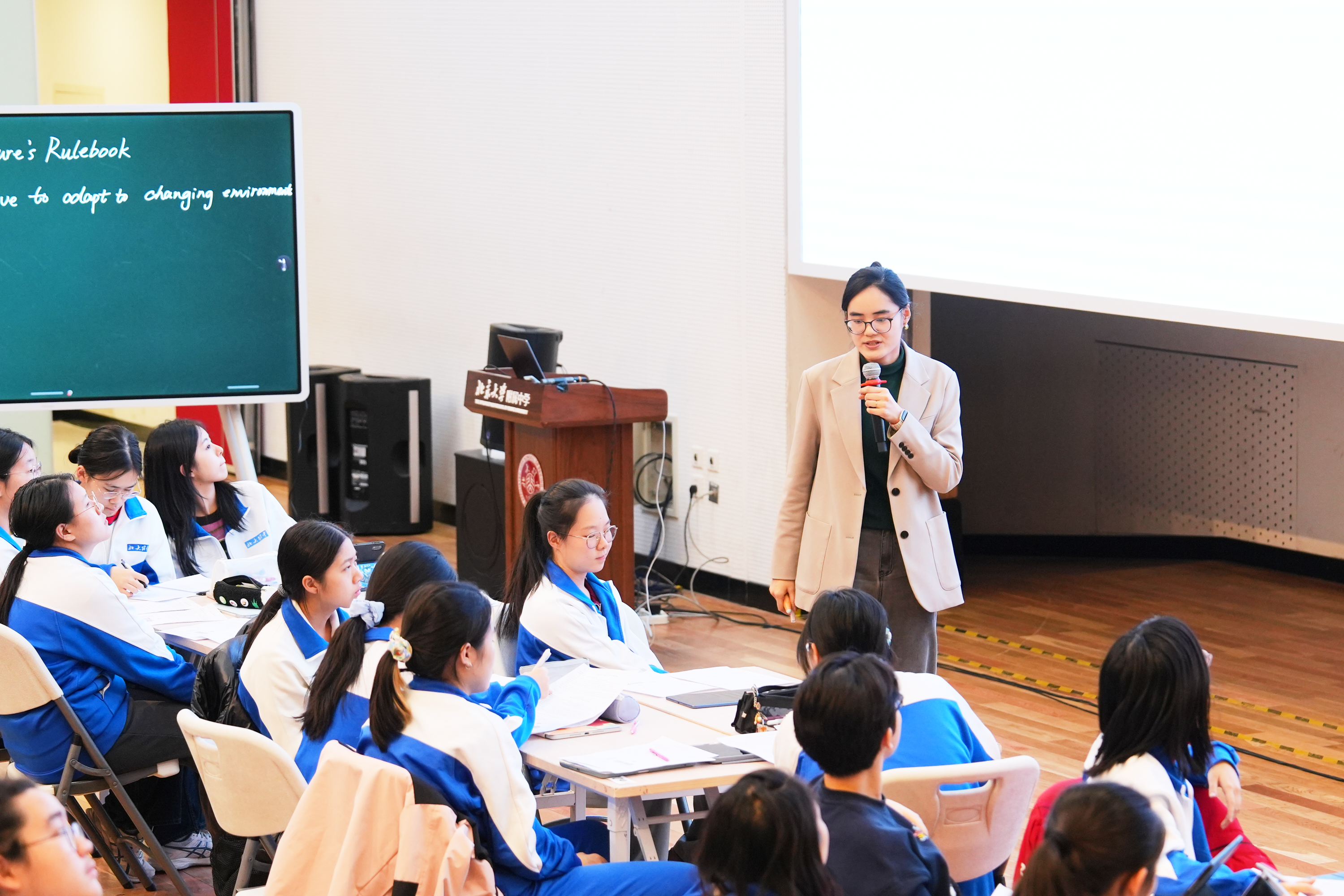北大附中高三英语骨干教师马芊老师则呈现了一节以“自然的规则之书(Nature’s Rulebook)”为主题的阅读复习课。课堂突破教材限制,整合多源语篇与图例,引导学生沿“发现—验证—应用规则”的主线,通过群文阅读构建对自然规律的完整认知。教学全程以“主题语块”为支架,推动学生在多样表达中反复调用与内化,有效促进知识向能力的转化。最终,学生通过书评写作任务实现以读促写,圆满践行了“学习理解—应用实践—迁移创新”的英语学习活动观,达成了语言能力与思维品质的协同提升。