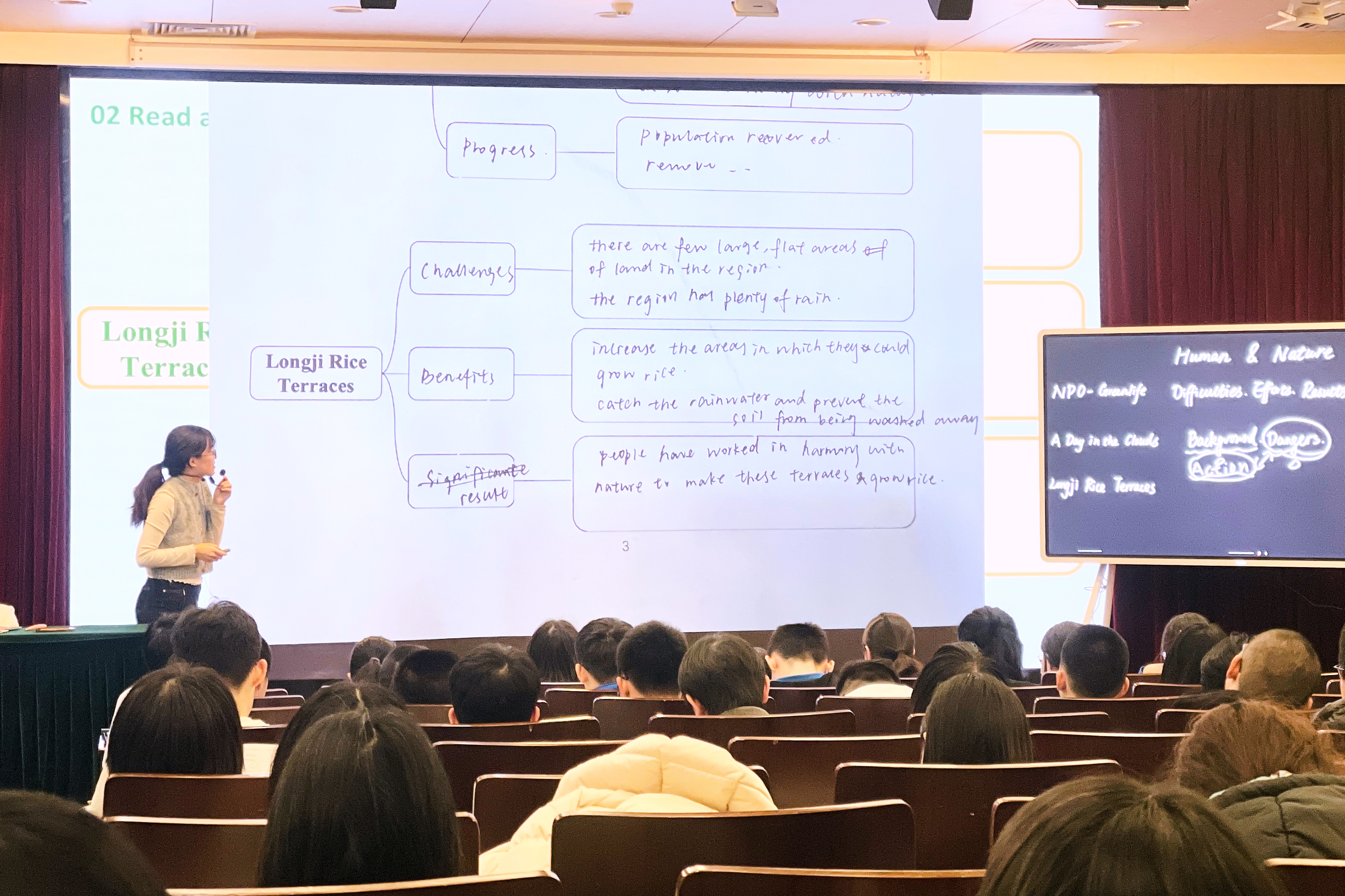 在图书馆报告厅会场,北大附中高三英语骨干教师熊晨珺老师呈现了一节以“与自然和谐相处(Live in Harmony with Nature)”为主题的微写作复习课。课程创新性地整合北师版、外研版及人教版三套教材的相关课文,从个人、传统与国家三个维度构建起学生对“人与自然和谐共生”的立体认知。课堂以思维导图为核心工具,采用“教师示范—学生实践”的模式,引导学生运用“挑战—行动—成果”框架梳理文本,并通过小组合作提炼核心理念。最终,学生在一项微型写作任务中,灵活运用所学的语言与结构进行有效输出,成功实现了从多文本知识整合到写作能力迁移的飞跃,展现了语言与思维融合发展的复习成效。