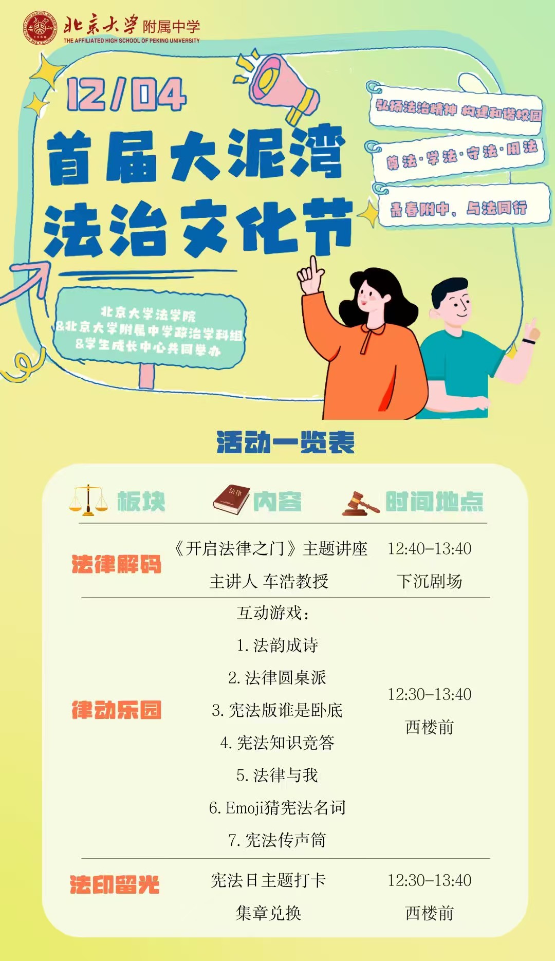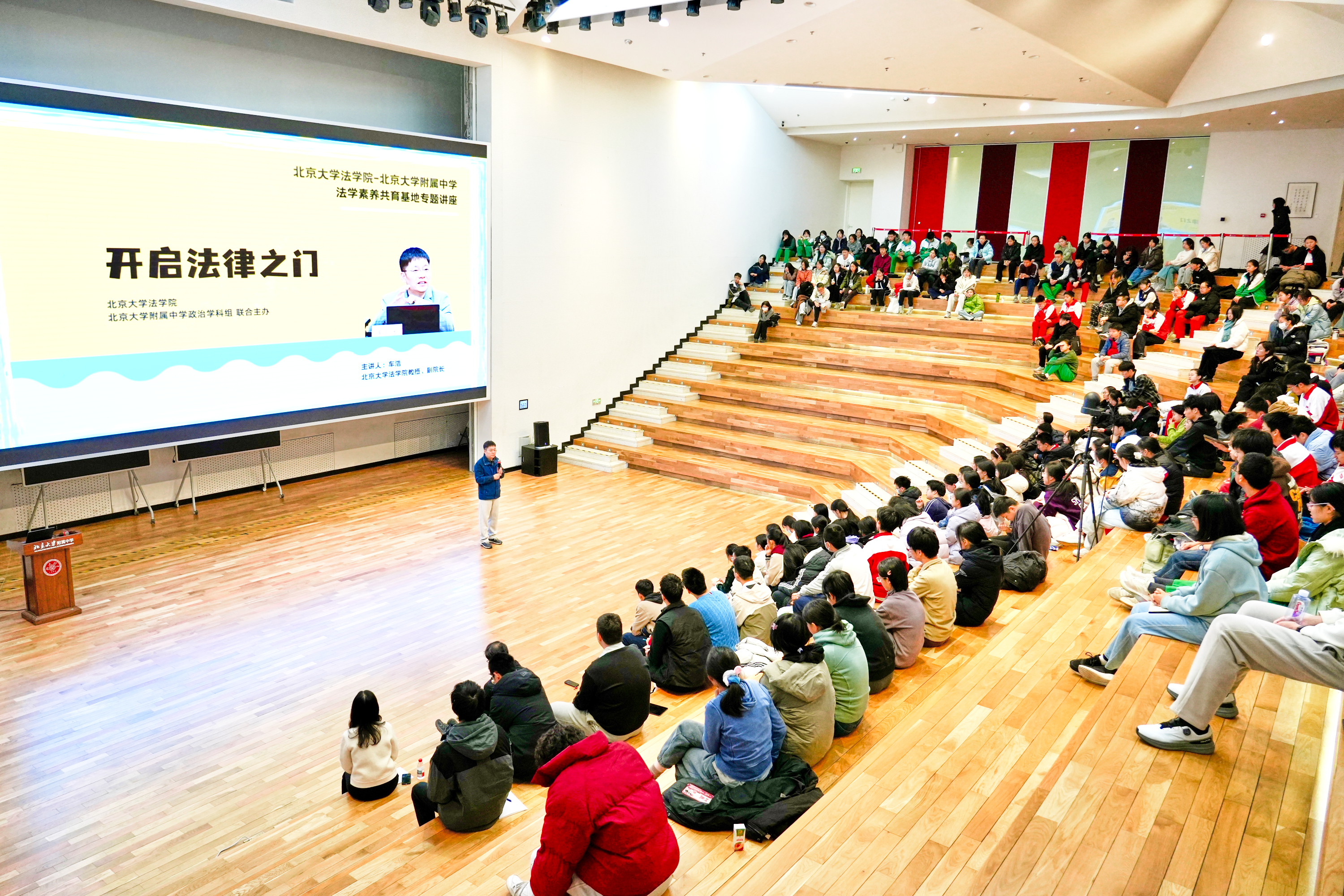 2025年12月4日,恰逢第十二个国家宪法日,北京大学附属中学首届法治文化节在下沉剧场与西楼广场前正式启动。本次活动由北京大学法学院、北京大学附属中学政治学科组与学生成长中心联合策划,通过名家讲座、游园互动等多元形式,编织了一场青春与法律的生动对话,让宪法文化与法治精神在互动中鲜活起来,在感悟中深植人心。