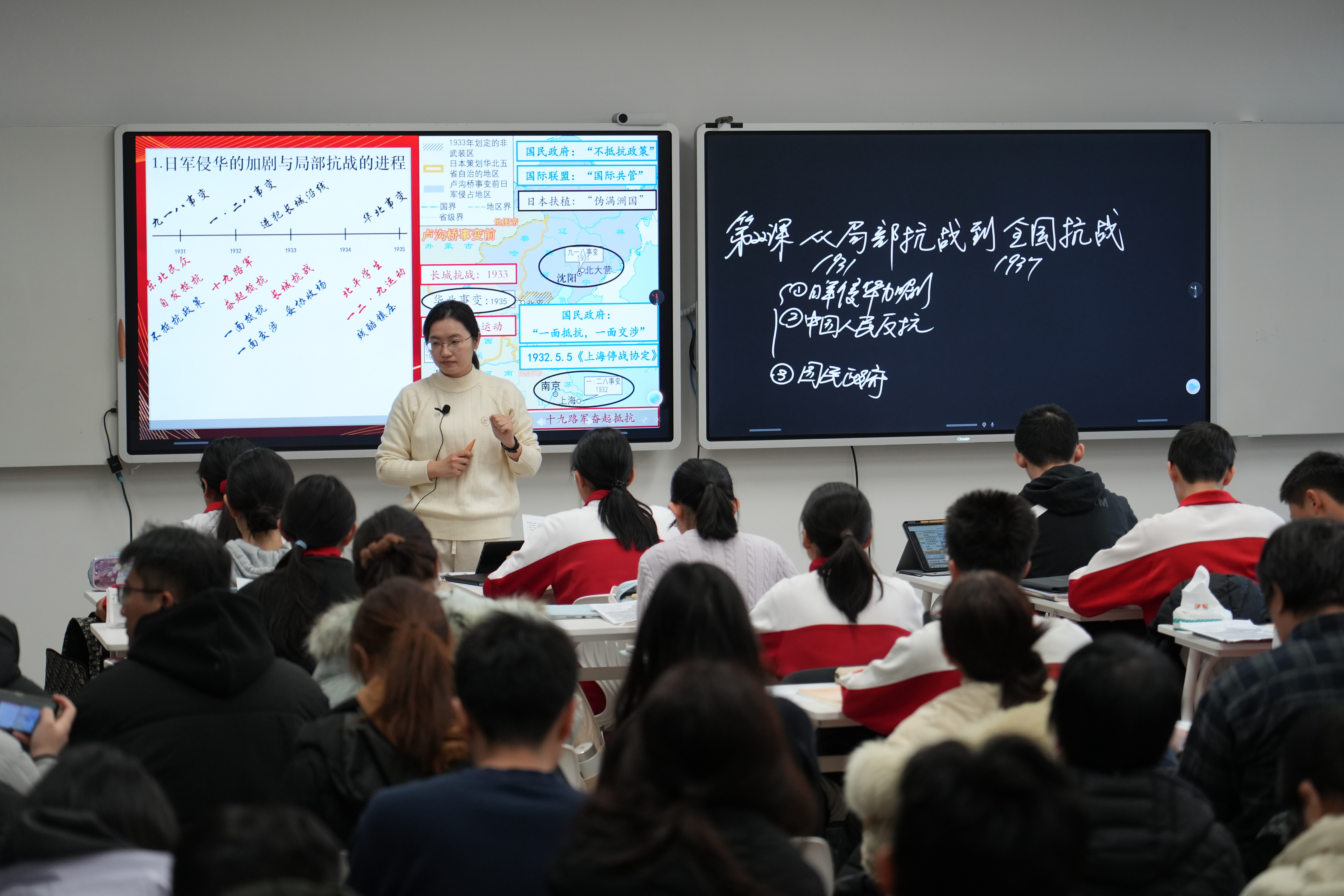 李莹萌老师从中国人民战争的不同英语翻译着手,以局部抗战、时局转换、全国抗战三个部分串讲了高中纲要课例《从局部抗战到全国抗战》。在讲解“西安事变及其和平解决”时,学生分小组讨论了事变各方如何决策,教师引入了AI助教对其论证作了即时的过程性评价。李晓风老师、赵建建教授进行了点评。