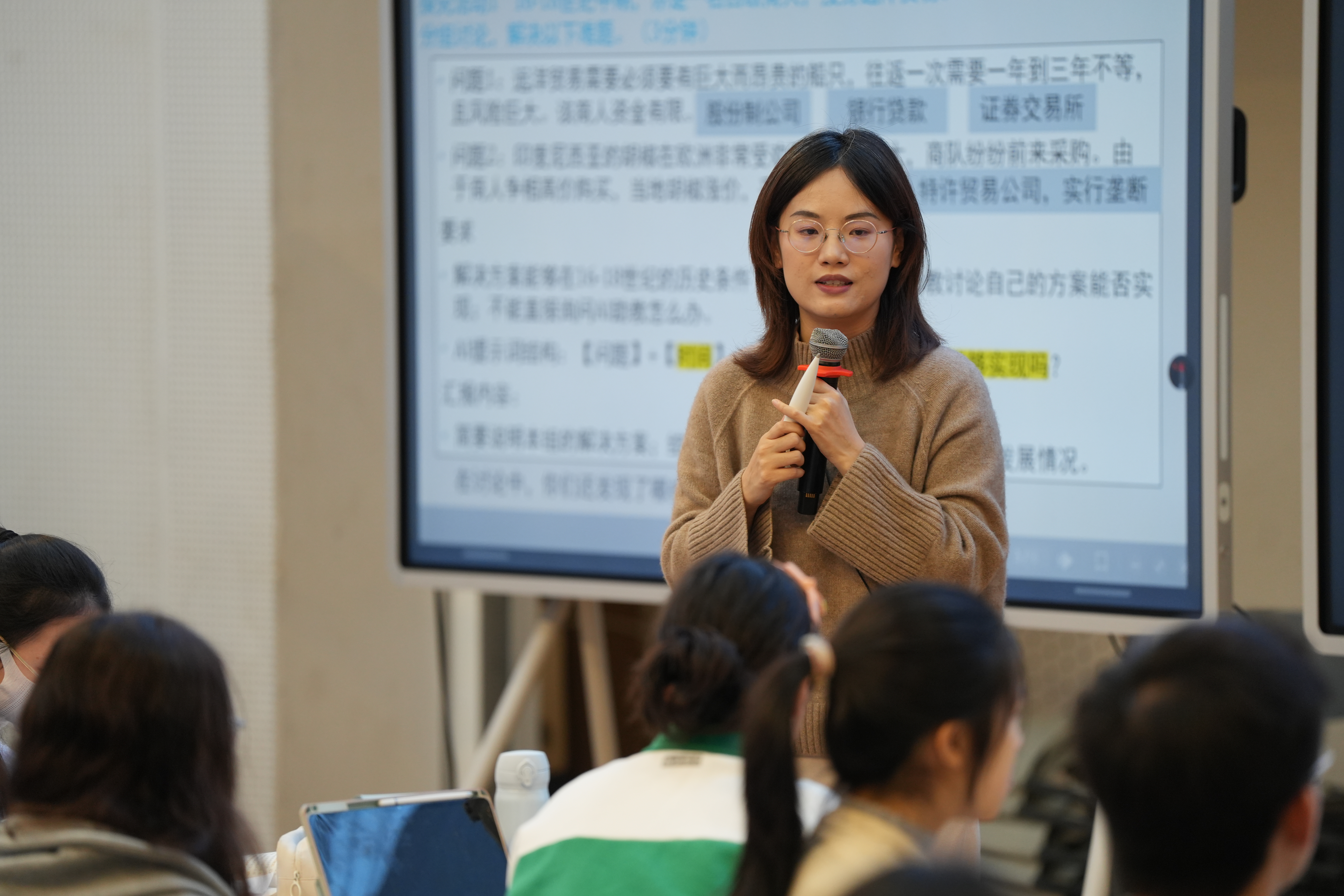 高中选择性必修课例分享《近代商业贸易的变化》在下沉剧场举行,由李丹阳老师担任主讲人。学生在课堂上尝试与AI对话纠正论证思路,以解决教师提出的问题,AI助教成为了教师评价学生思维过程、了解学生思维弱点的有效渠道。杨朝晖教授、郭井生教研员参与了点评与交流环节。