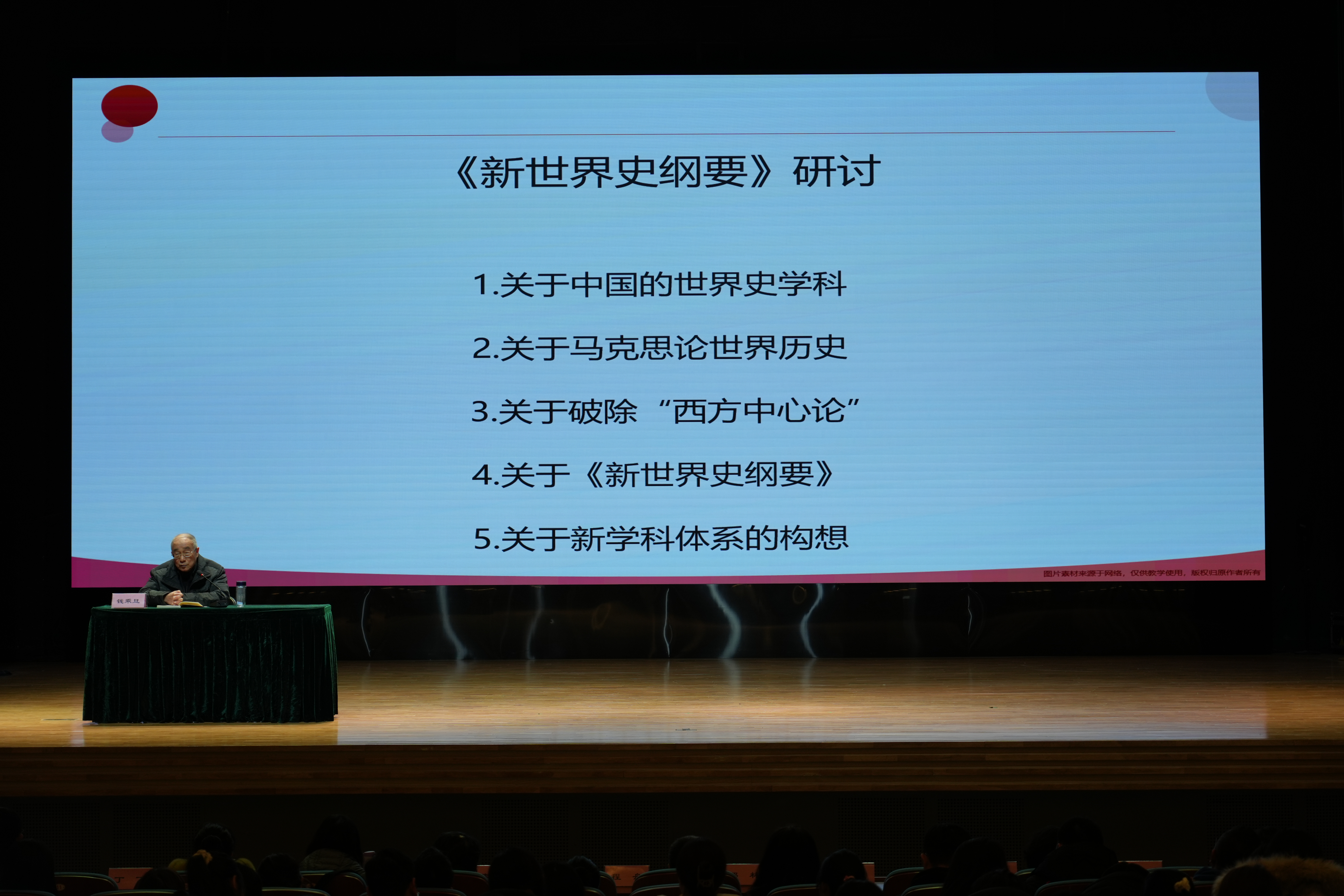 作为年会的高潮,专家报告环节在北大附中致蕙礼堂接续举行。年会邀请到钱乘旦教授,围绕钱老师主编的《新世界史纲要》进行分享与研讨。钱承旦教授结合中国的世界史学科发展历程,指出世界史学科的英、法、德、俄、美几个国家的研究较多,观点则以苏联、西方体系的糅合为主,长期没有形成自己的研究体系。他表示,破除“西方中心论”、构建中国自主的知识体系十分必要。讲座引发了与会教师的积极讨论,反响热烈。
